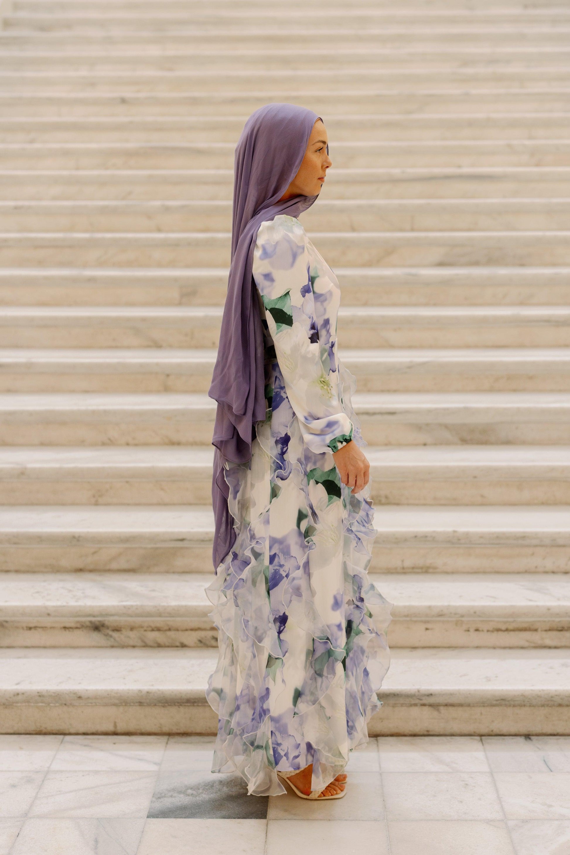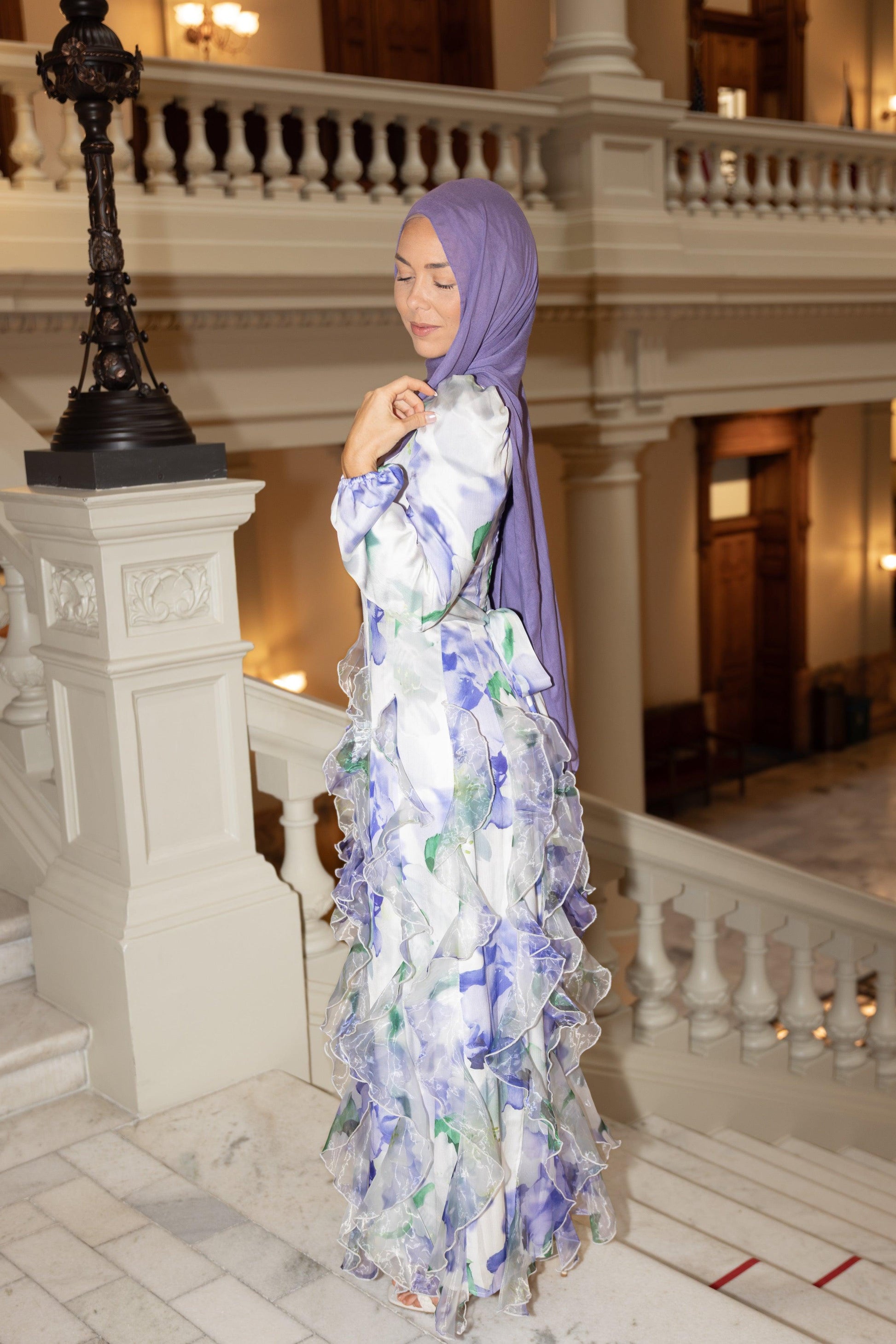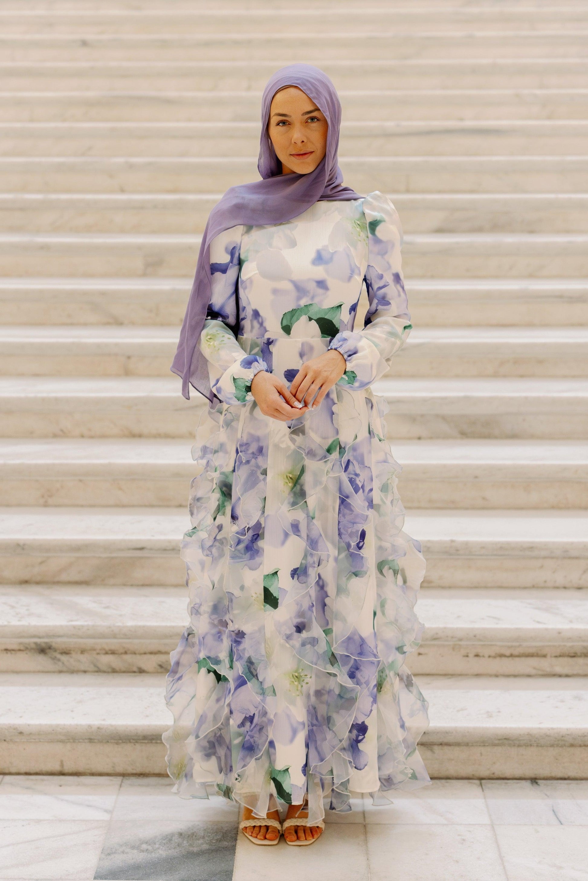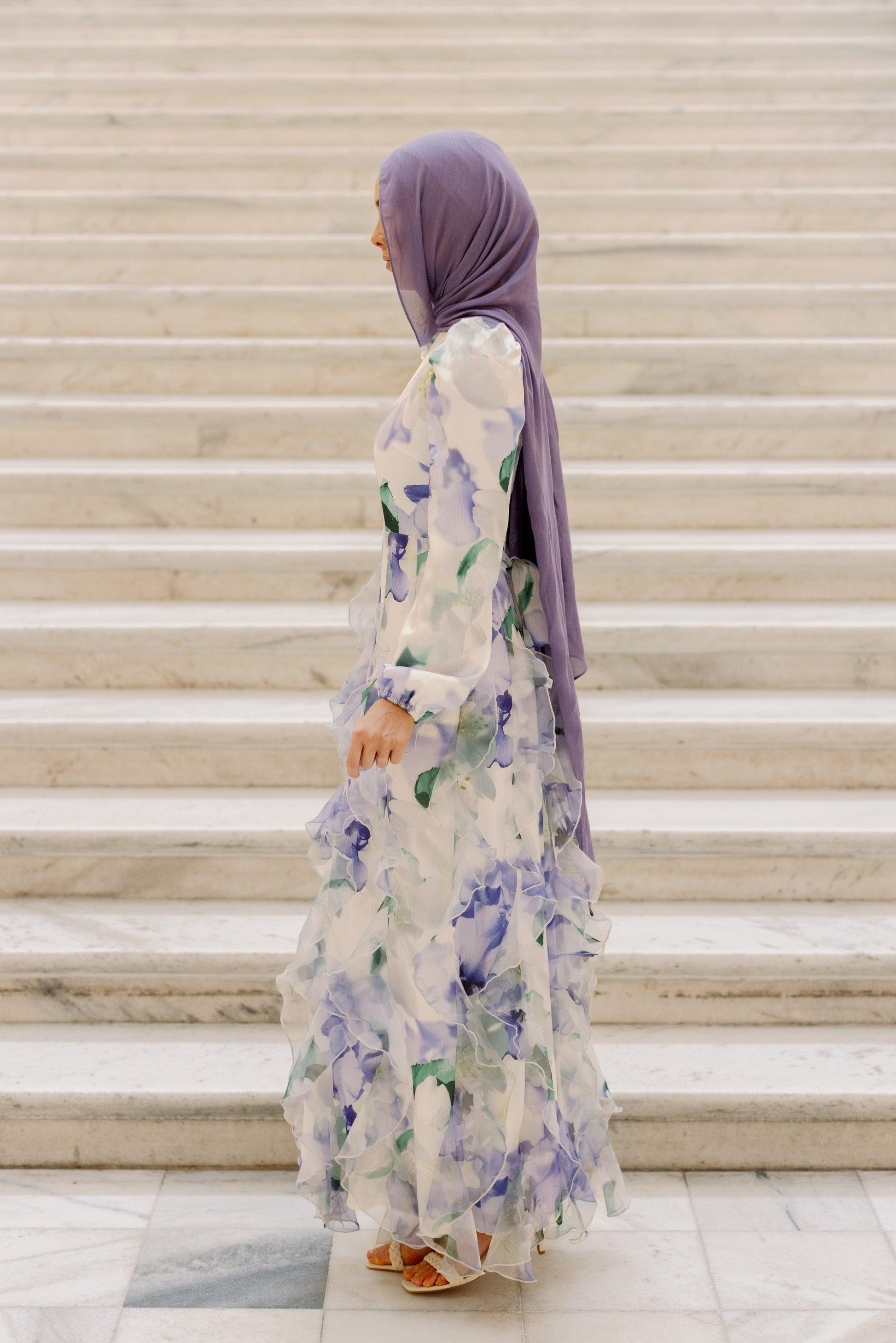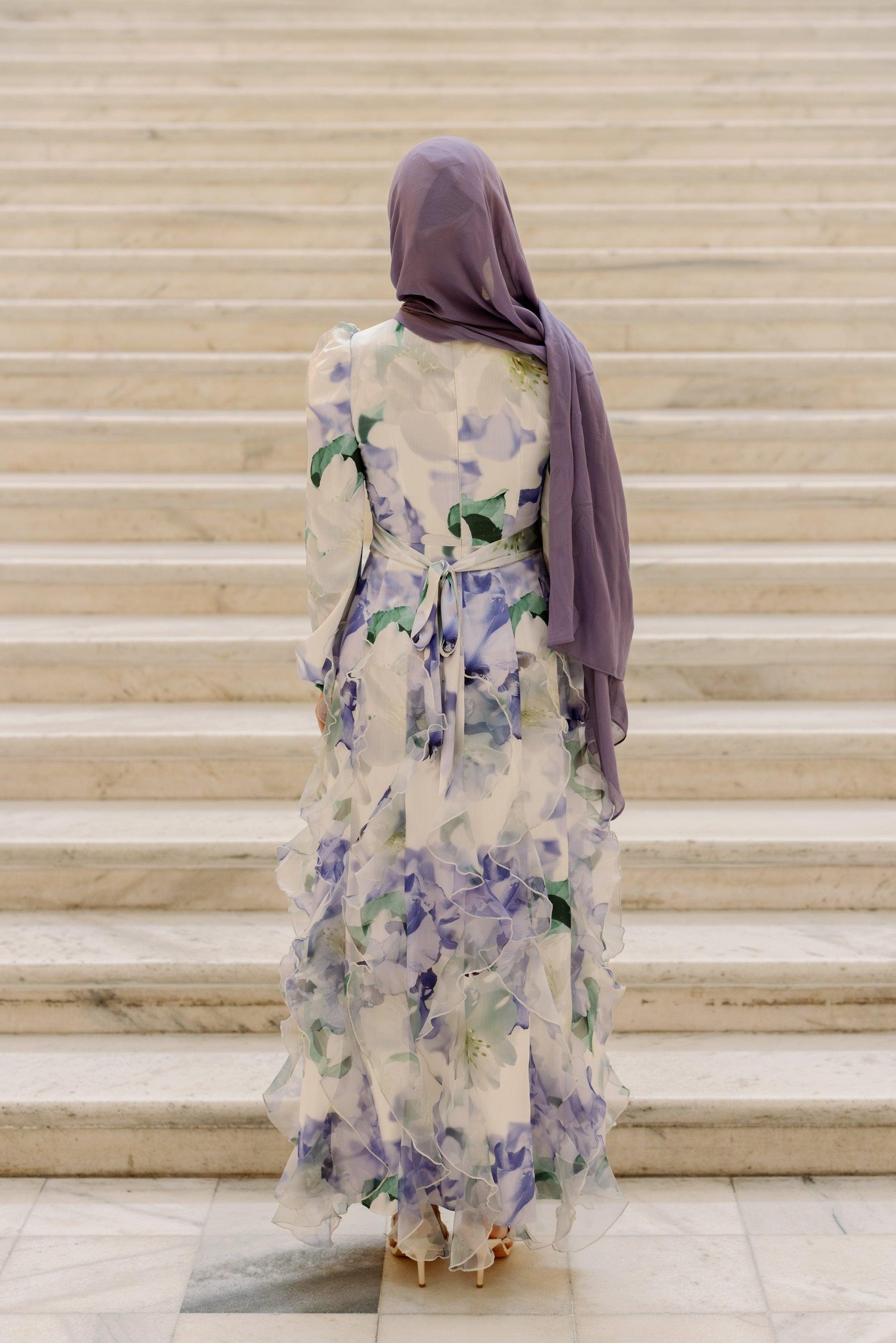 This dreamy full-length dress showcases delicate watercolor florals, adding a romantic touch to its design. Featuring layered organza ruffles and a flowing silhouette, it’s perfect for special occasions or elegant daywear. Fully lined with a modest fit, this dress brings a touch of grace and charm to every step. This dress is final sale.